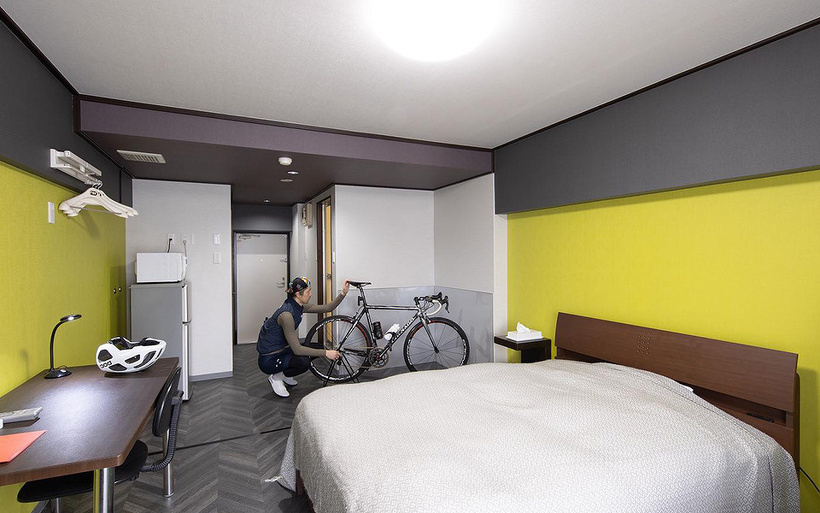 フロントでチェックインし、そのまま自転車を持ち込める広い部屋。そしてホテル近くにメンテナンスもでき、仲間と語らう事もできるスペースを設けました。