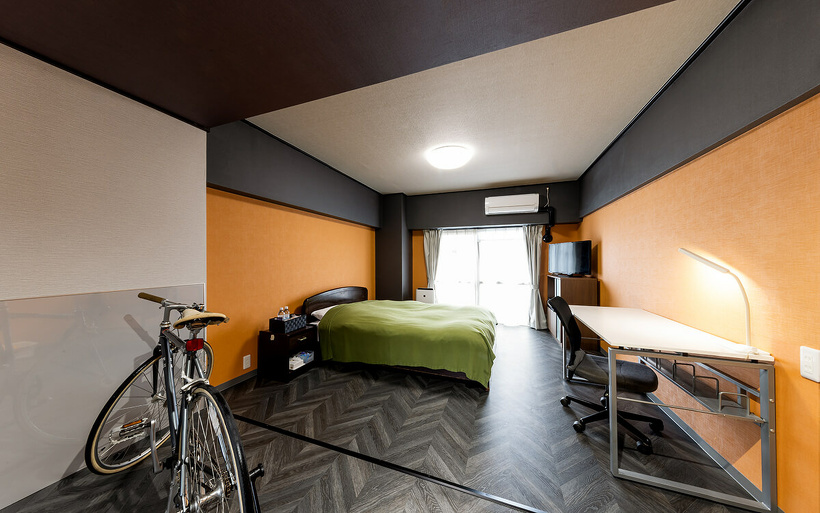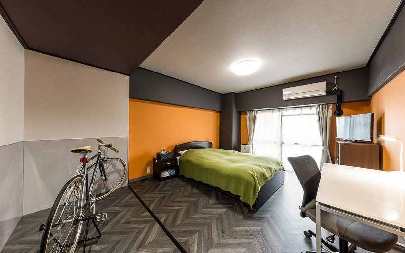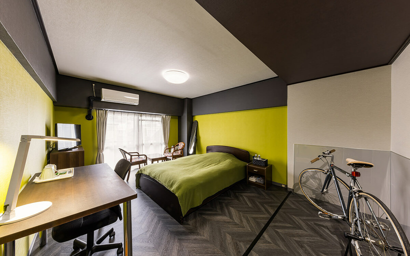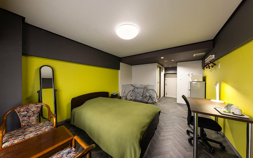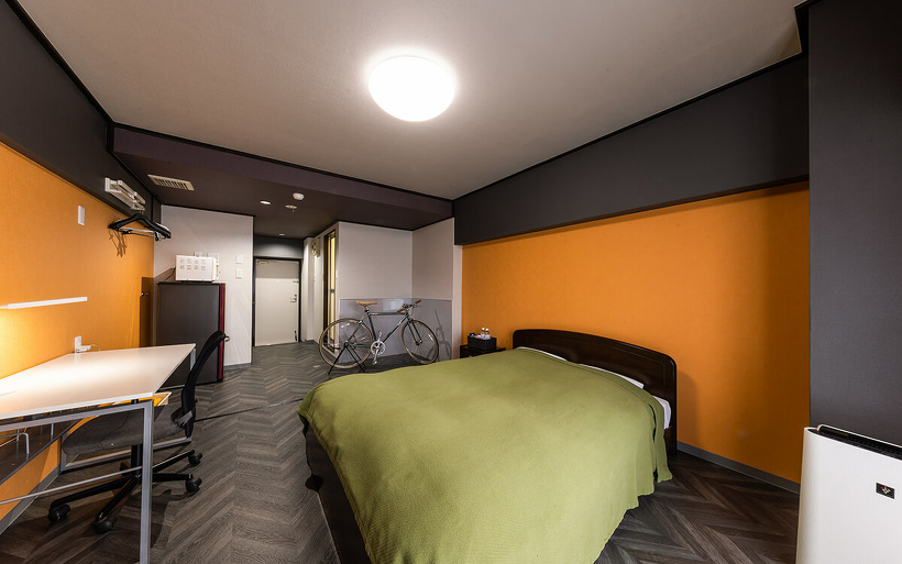 自転車に乗ったままチェックインできるフロント。自転車は、持ち込み可能。サイクルハンガーを設置しています。ルームタイプ指定不可ですが、どのタイプのお部屋も広々としたワンルームマンションタイプです。2F~4Fのフロアで対応可能です。