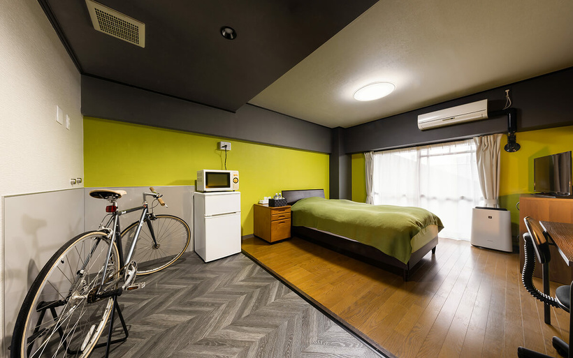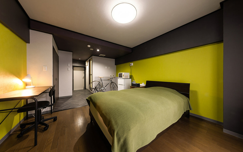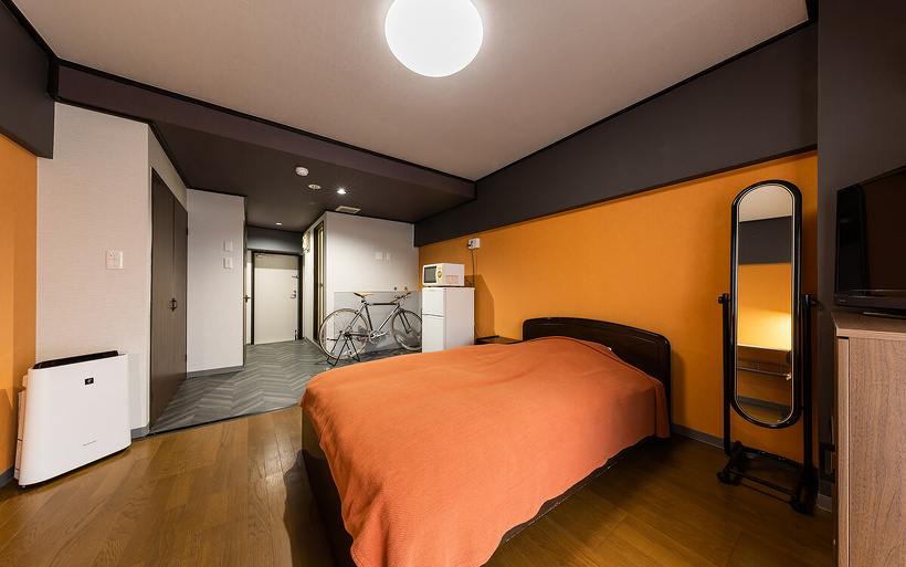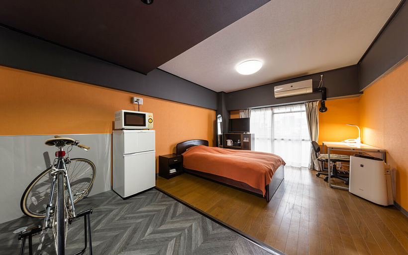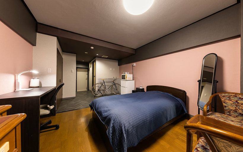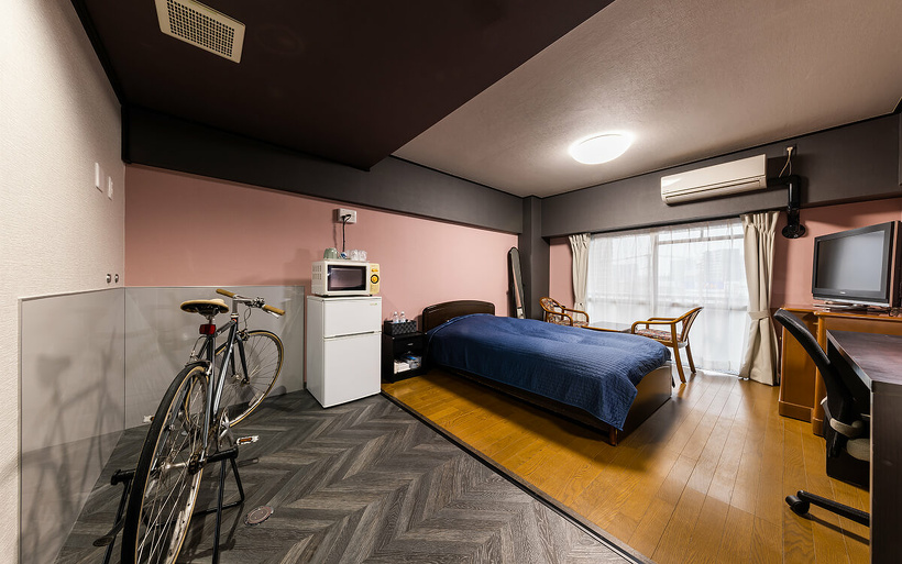 自転車に乗ったままチェックインできるフロント。自転車は、持ち込み可能。サイクルスタンドを設置しています。ルームタイプ指定不可ですが、どのタイプのお部屋も広々としたワンルームマンションタイプです。2F~4Fのフロアで対応可能です。