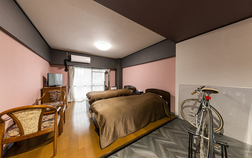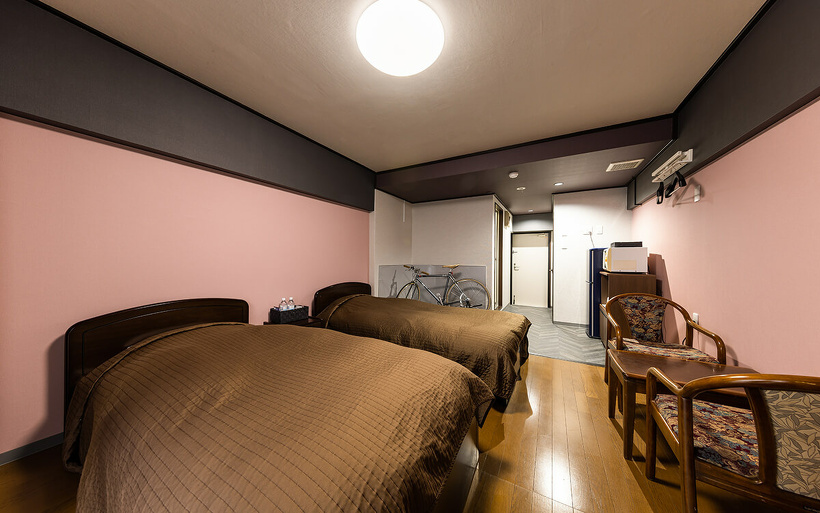 自転車に乗ったままチェックインできるフロント。自転車は、持ち込み可能。サイクルハンガーを設置しています。ルームタイプ指定不可ですが、どのタイプのお部屋も広々としたワンルームマンションタイプです。2F~4Fのフロアで対応可能です。
